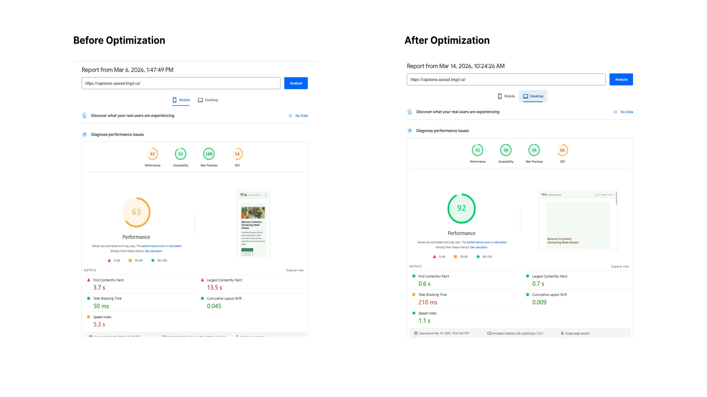 I tested the website using Google PageSpeed Insights and accessibility tools such as WAVE. The initial performance score was around 67, which indicated the need for optimization.
