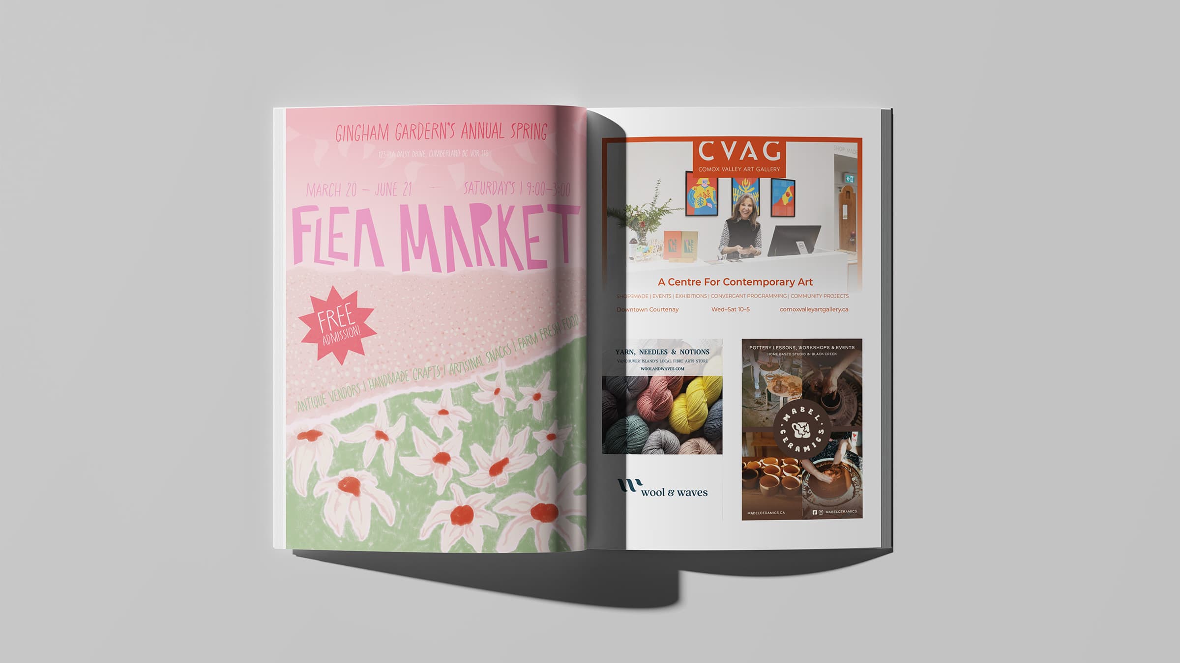 When designing for advertisements, I wanted to use a professional approach to best reflect my ability to execute such a task. Using brand–aligned businesses in the Comox Valley, I created three distinct advertisements. For a fun challenge, I also illustrated one full–page event ad of a fictional flea market. My goal was to include both functional and artistic renditions on advertisements to test their relative impression within a magazine.