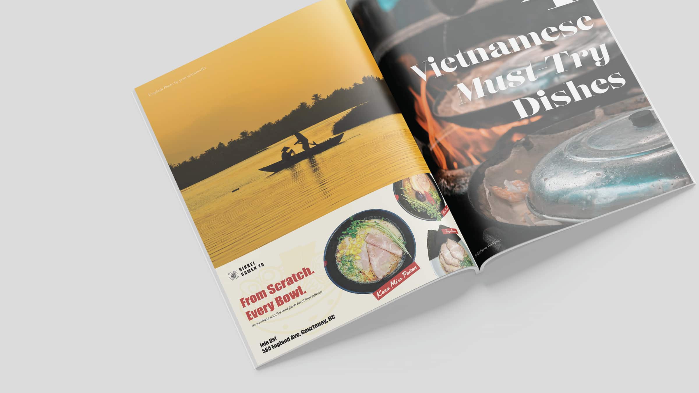 I included two advertisement spreads that fit naturally within the magazine theme. The first advertisement promotes a ramen restaurant, using a simple poster-style layout with strong visuals to highlight the product. The second advertisement focuses on a Vietnamese airline, which makes sense within a travel magazine context. For both designs, I made sure they blend well with the overall style of the magazine by matching colors, layout structure, and visual tone. This way, the advertisements feel like part of the reading experience instead of separate or disconnected pages.