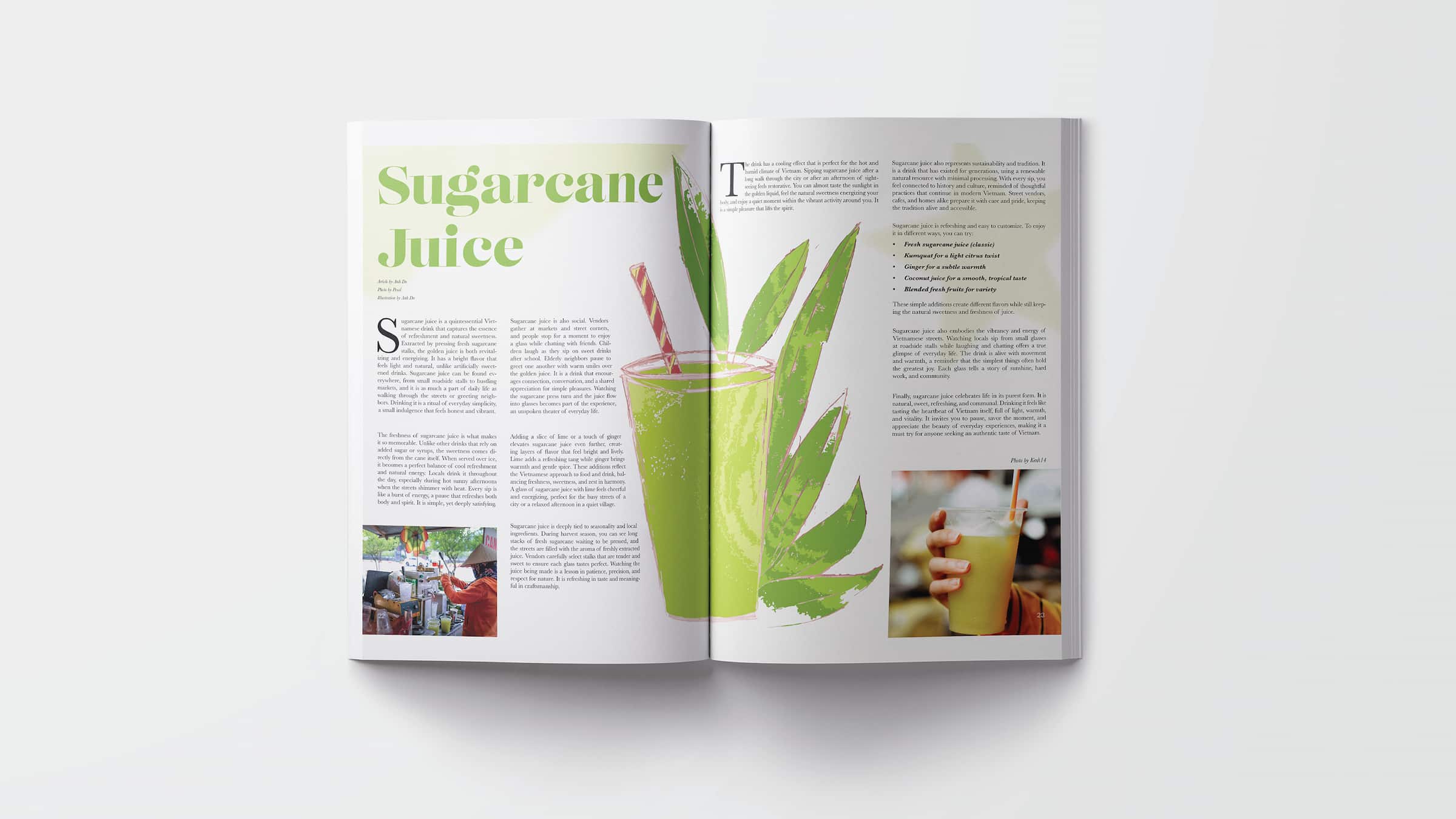 For the illustrations, I created three pieces that add a more personal and handmade feel to the magazine. The first illustration features Ben Thanh Market in Ho Chi Minh City, using a loose and sketchy style that gives it a lively and rustic character. The other two illustrations focus on Vietnamese coffee and sugarcane juice, which are very popular everyday drinks in Vietnam. I intentionally kept the drawings slightly messy and imperfect to match the vintage and organic style I was aiming for. These illustrations help balance the photography and add a unique visual layer to the overall design.