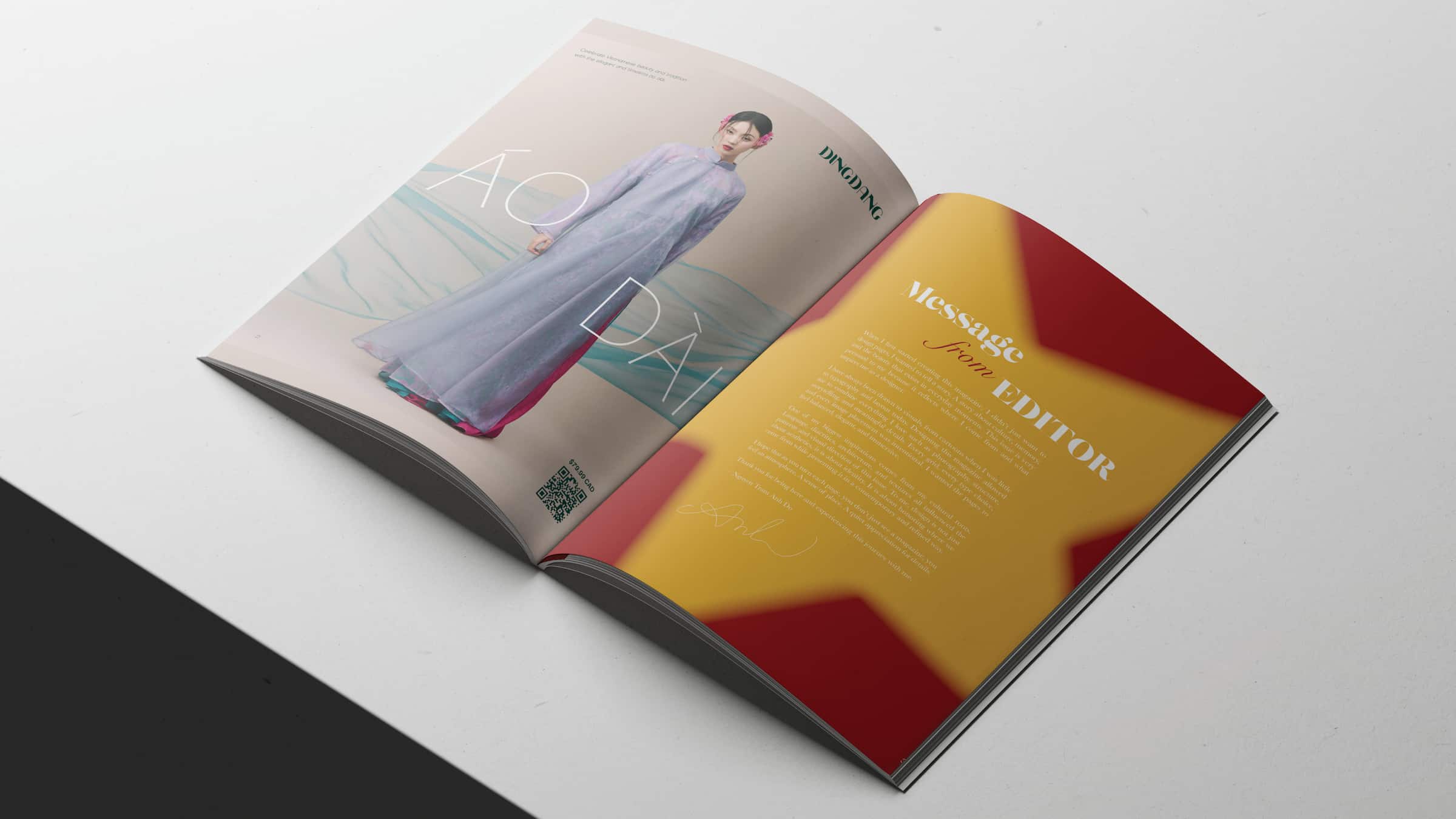 For the advertisement page, I chose to promote a Vietnamese clothing brand featuring the traditional Ao Dai. The design focuses on strong, high-quality photography, combined with simple typography to keep the layout clean and elegant. I also included a QR code so readers can easily access the brand online, making the design more interactive. For the editor’s message, I used a background inspired by the Vietnamese flag, with a red base and a yellow star. This creates a bold and meaningful visual that connects directly to the theme of the magazine while introducing the content in a personal way.