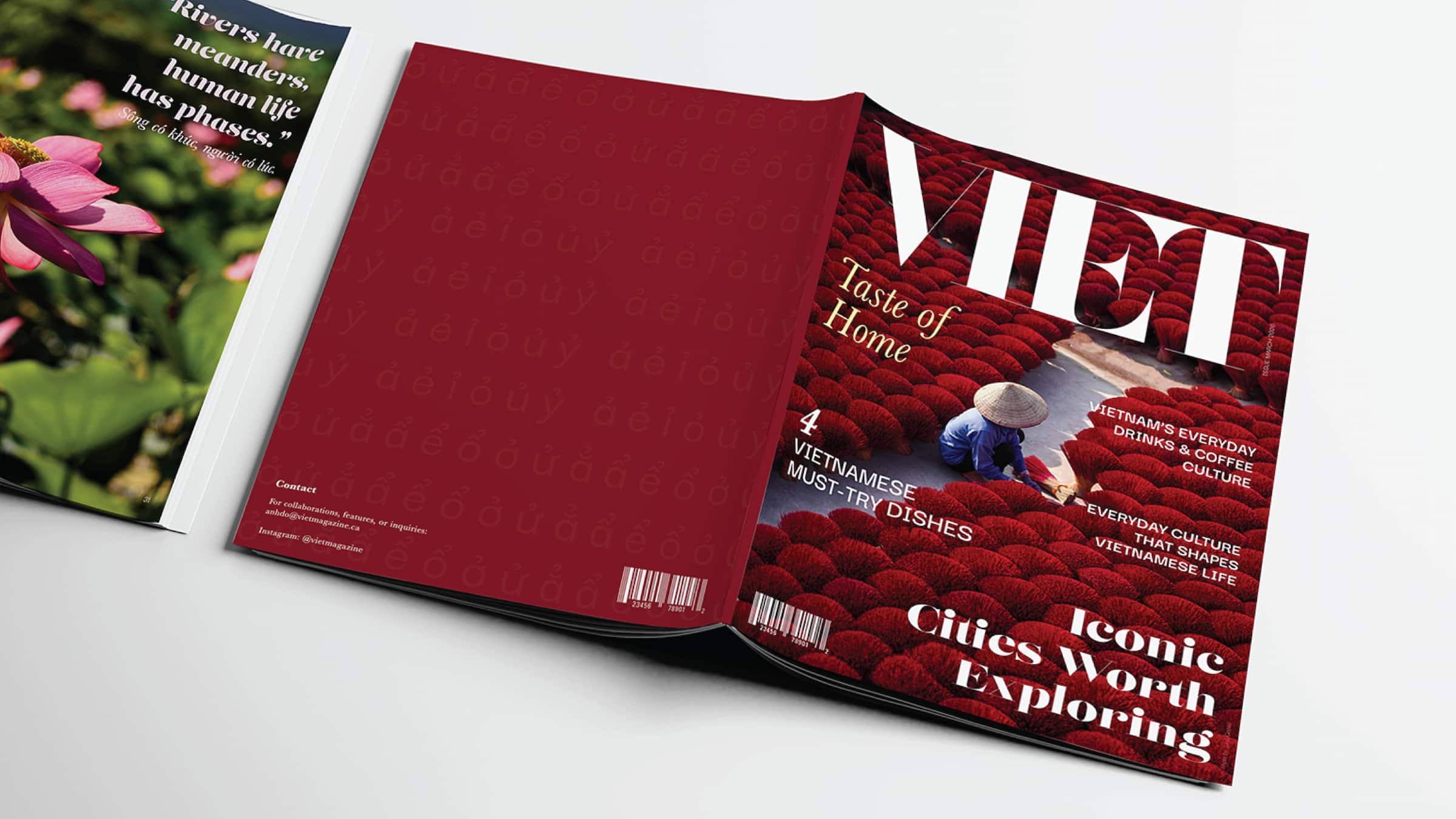 For the front cover, I wanted to create a strong first impression that immediately catches attention. I used bright and vibrant photography, especially with red tones, to connect with the brand identity and create visual impact. The “Viet” logo is placed clearly at the top, followed by the subtitle “Taste of Home,” which introduces the theme of the magazine. I arranged the feature titles in a clean and organized way so they are easy to read while still looking dynamic.