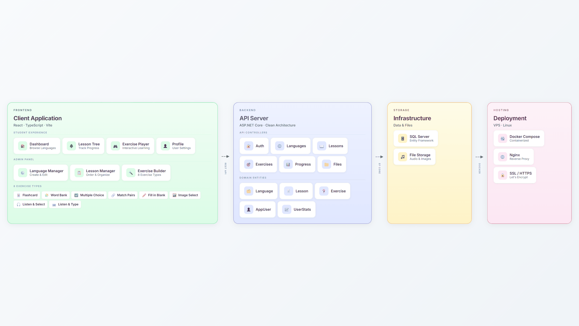 The project was completed in 76 hours across four development phases. All MVP features are functional: full content management for languages, lessons, and exercises; eight exercise types with audio and image support; JWT authentication with role-based access; progress tracking with experience points (XP) and scoring; and a responsive interface tested on both desktop and mobile.