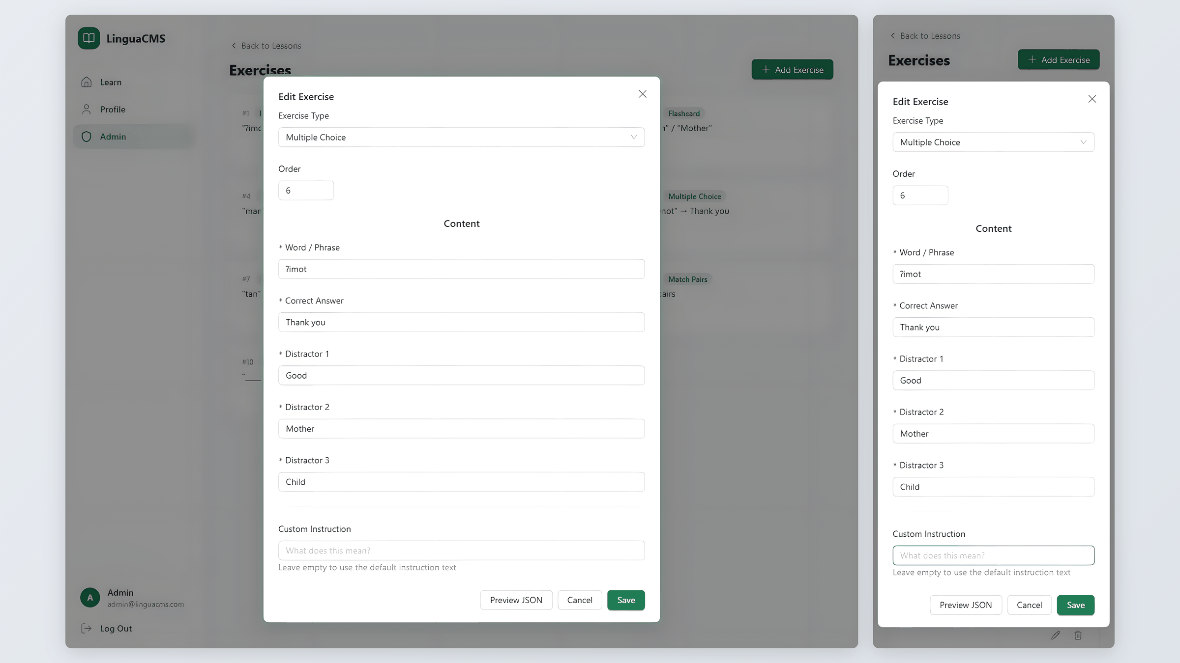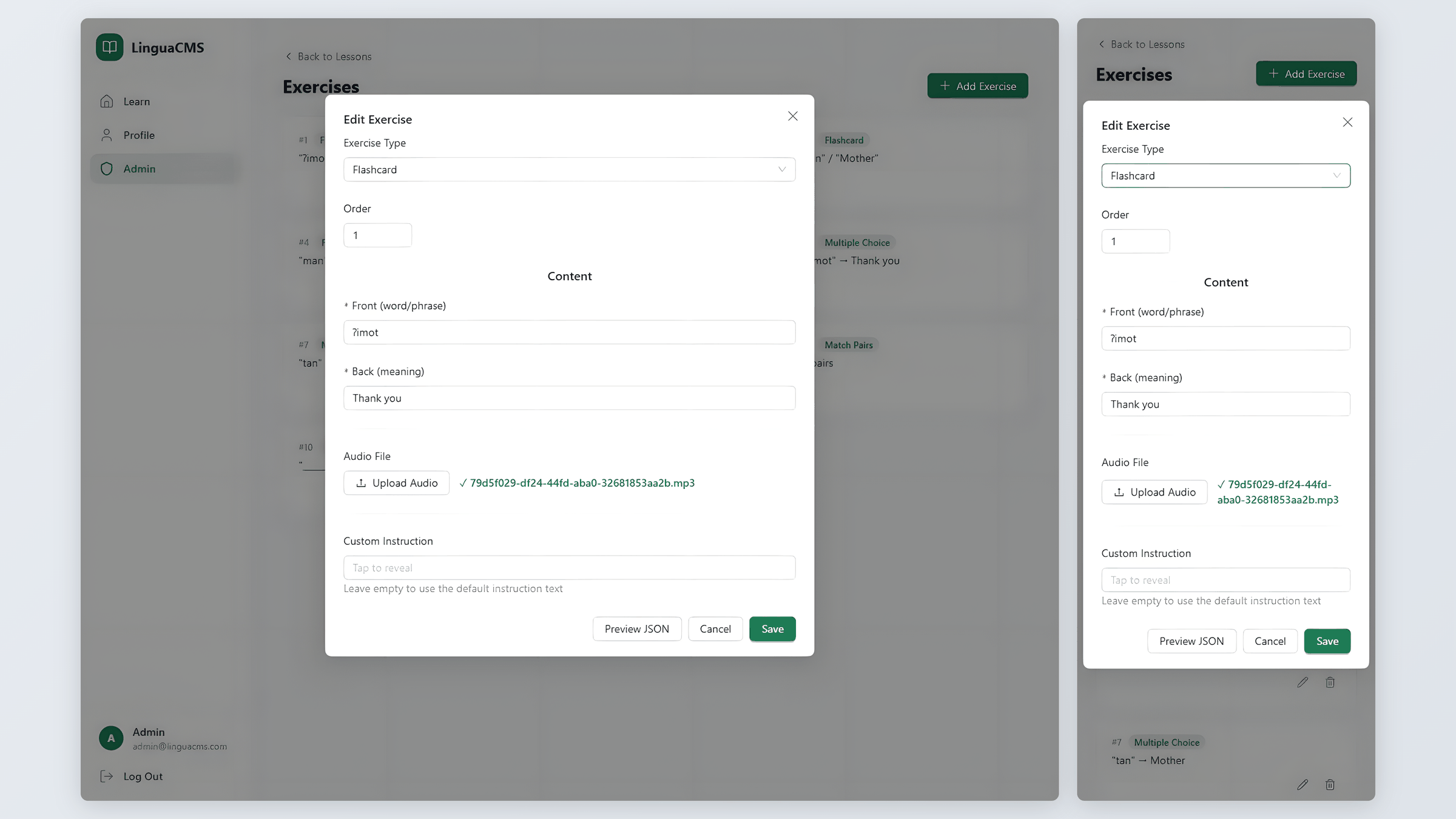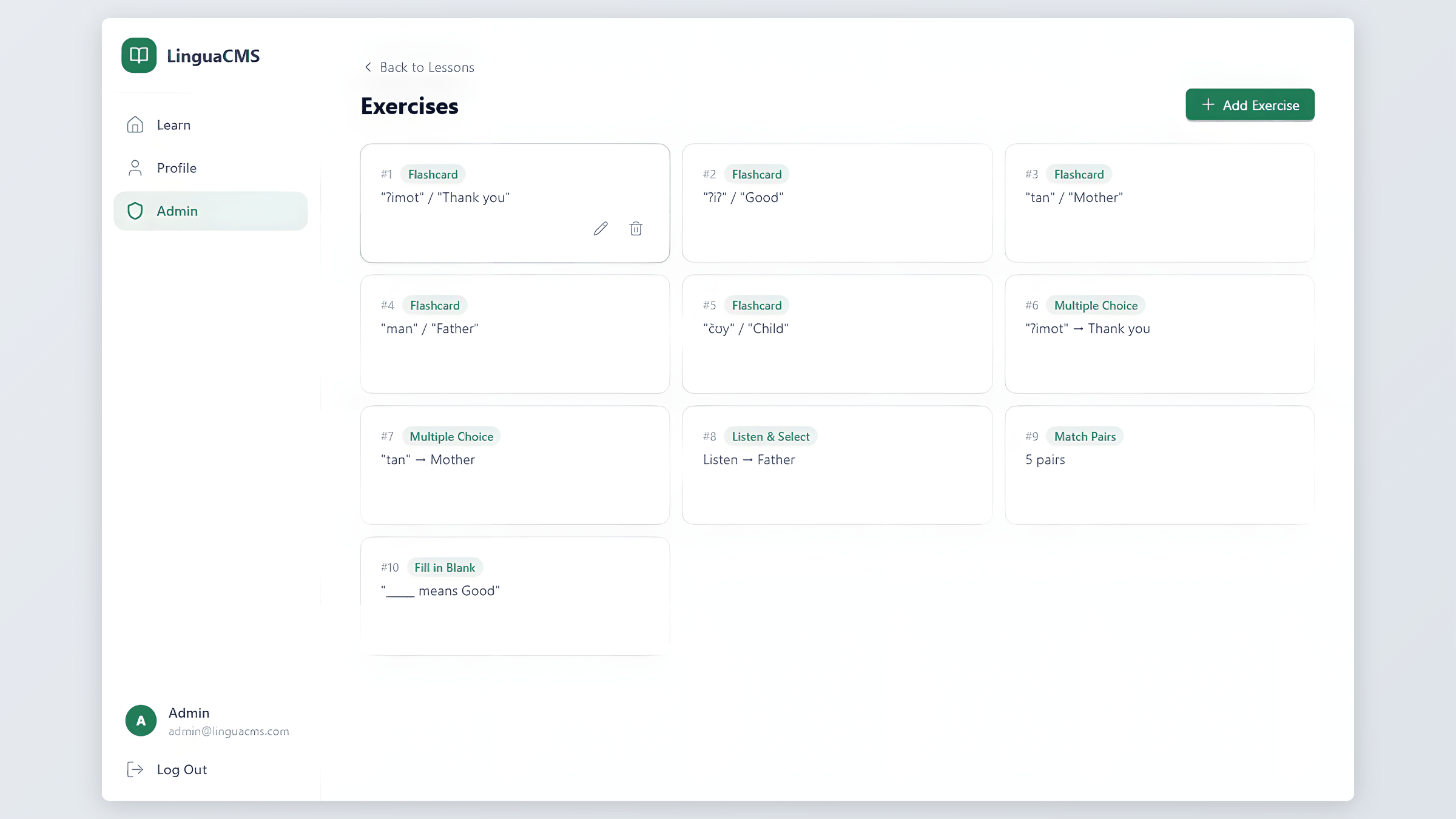 The admin side is where LinguaCMS goes beyond a learning app – it is a course builder. Educators create languages, organize them into lessons, and build exercises through a visual form builder. No coding, no JSON editing, no technical background required.
