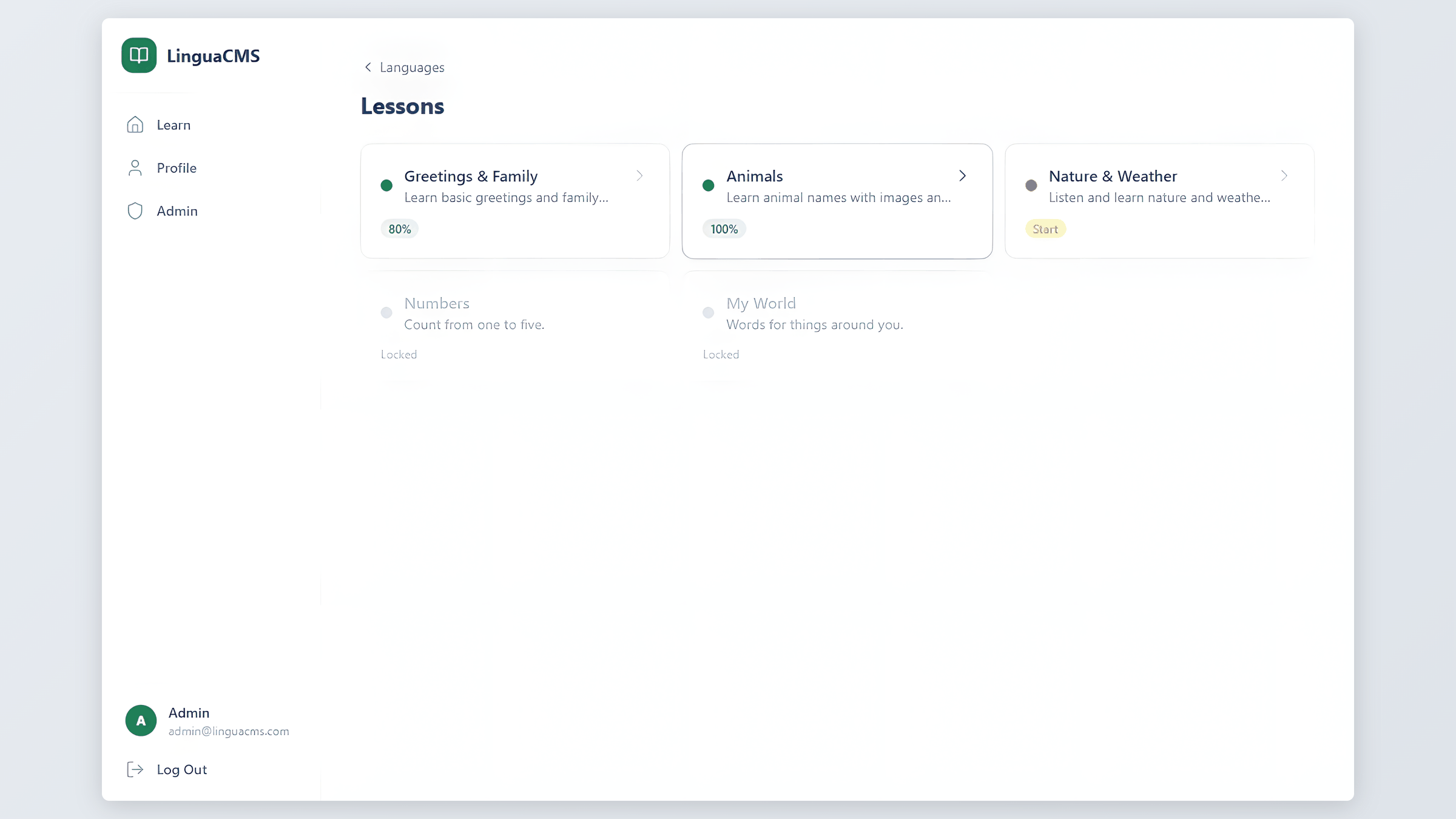 The student side follows a simple path: browse available languages on the dashboard, pick one, and open the lesson tree.