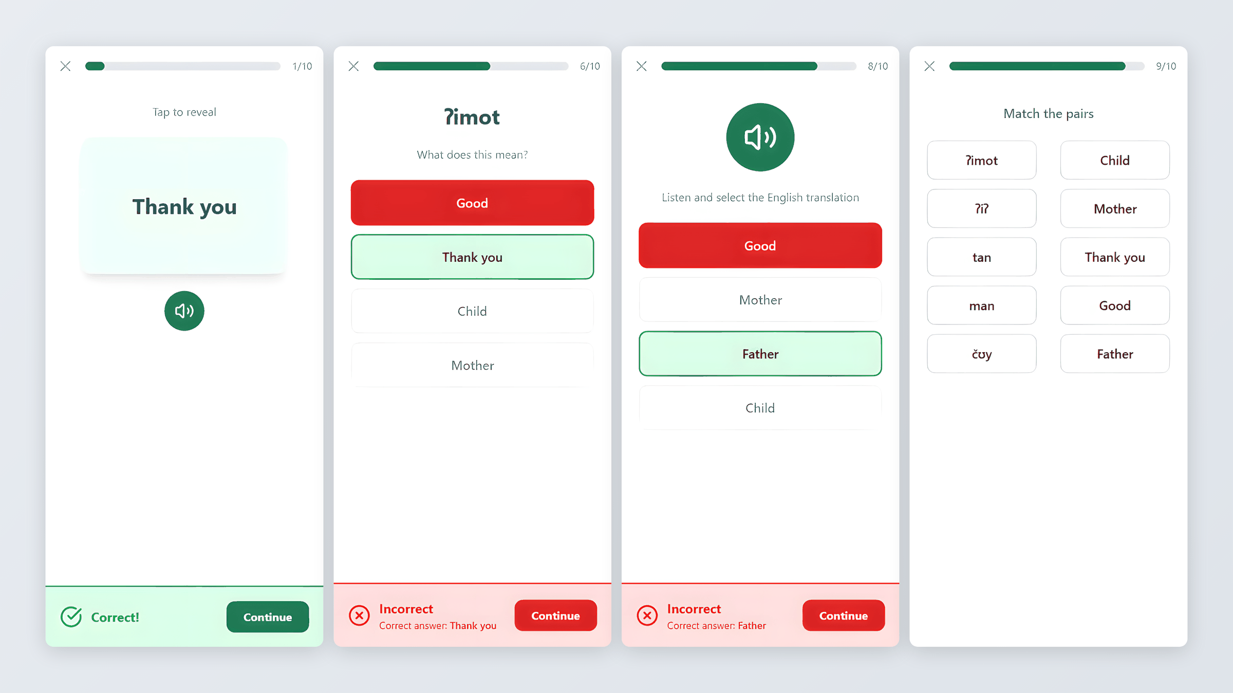 After a mid-project critique, I received feedback that flashcard scoring (“Knew it” / “Didn’t know” buttons) added unnecessary pressure and did not fit the platform’s learning-first approach. I removed scoring entirely and redesigned flashcards as a pure learning element – show the word, reveal the translation with optional audio playback, and continue. This was a scope reduction that genuinely improved the user experience.