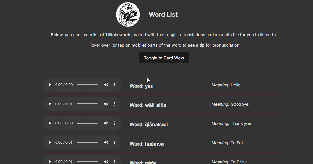 The main objective behind creating the language learning app was to create a place that people can use to learn the basics of ’Wùik̓ala. This meant finding sources that could be incorporated into the app, since the language can be difficult to find due to lack of obvious sources. To ensure the information presented was correct, David Stevenson (a man who knows more about the language and relevant resources) was contacted, who then linked FirstVoices, a similar project that documents various Indigenous languages, one of which is ’Wùik̓ala. With permission from David, information about the language, including the audio files used, was incorporated for display in the app.